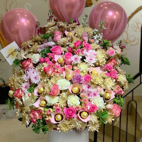 Fresh Flowers Box with Congratulations printed balloon &Customized Cupcakes
