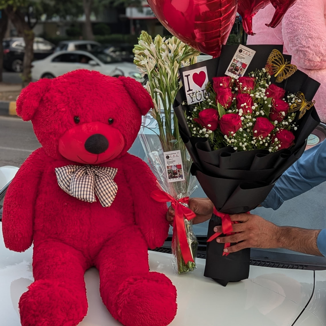🌹 Red Rose & Tube Rose Bouquet with Cute Red Teddy 🧸