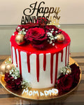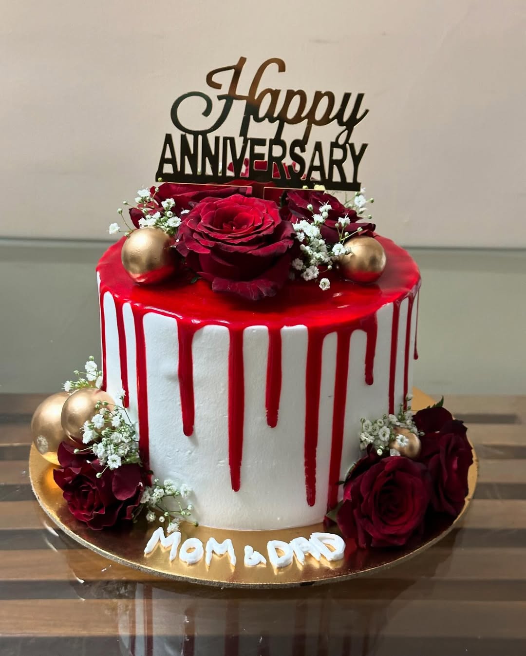- Customized Anniversary Cake – A beautifully crafted cake designed especially for your parents’ anniversary, featuring a red and white theme to symbolize love and purity.