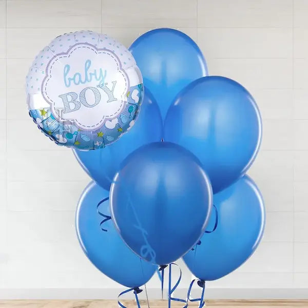 Welcome the newest addition with our set of 1 Baby Boy and 5 Blue Latex Balloons! Adorned in charming blue hues, they bring joy to any baby shower. Perfect for celebrating the arrival of a little one, they're a sweet reminder of love and happiness. Please Note : Latex balloons have a lifespan of 8 to 9 hours, while foil balloons can last 2-3 days when filled with helium.