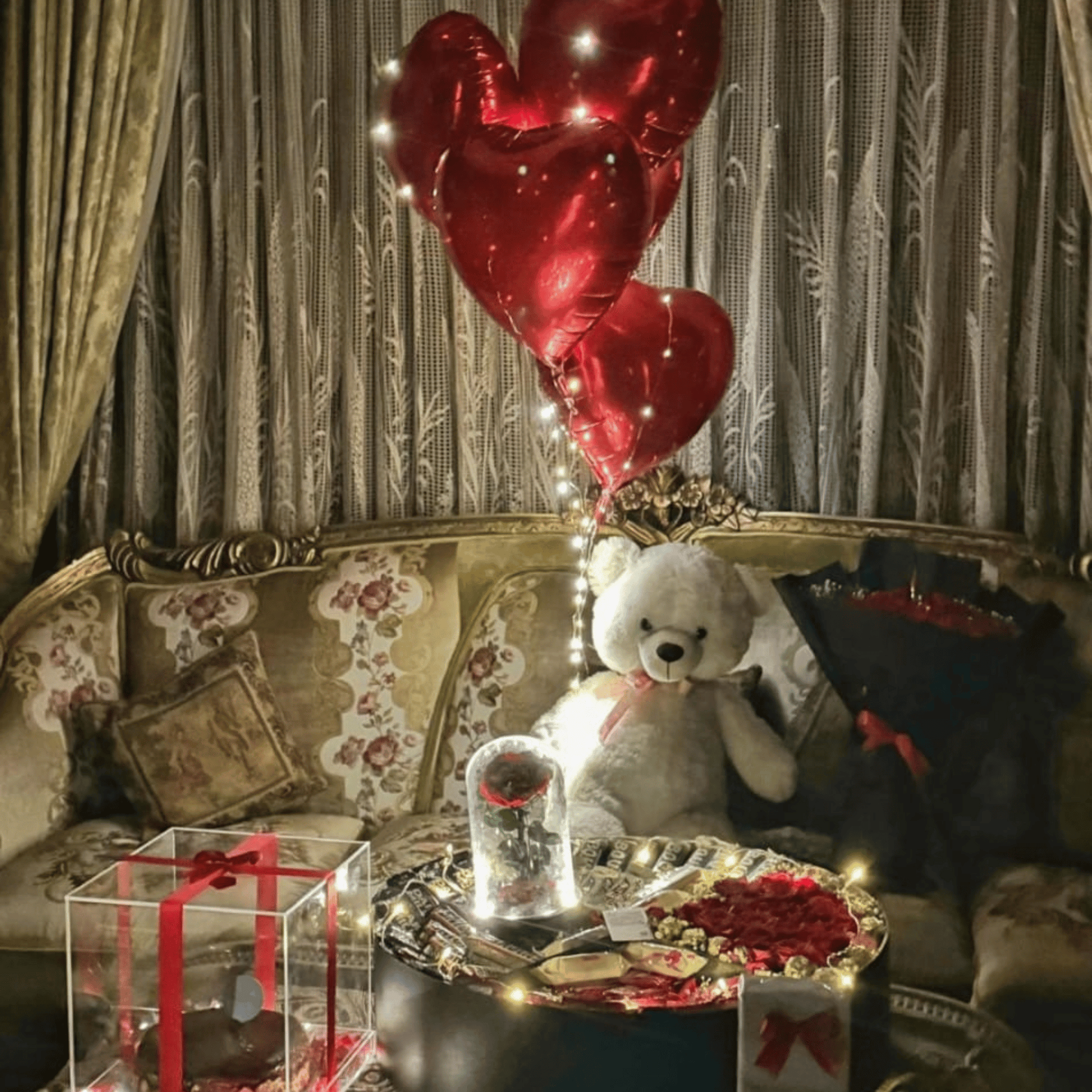 Luxury gift box with acrylic cake box, teddy bear, chocolates, perfume, preserved rose & heart foil balloons. A romantic surprise for any occasion.