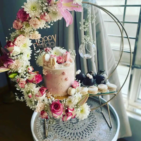 - Luxurious cake stand adorned with a stunning arrangement of premium imported flowers.