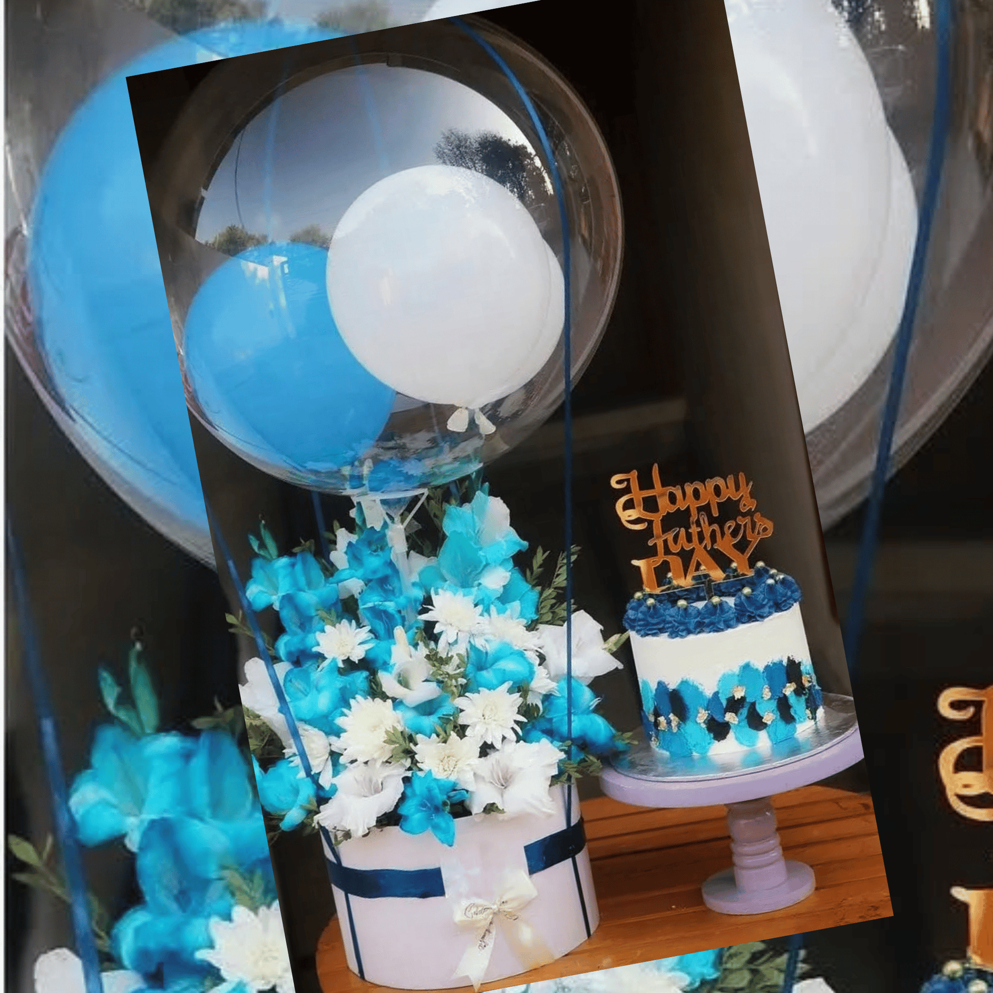 Transparent or white box filled with air-inflated mini balloons in blue, white, and gold