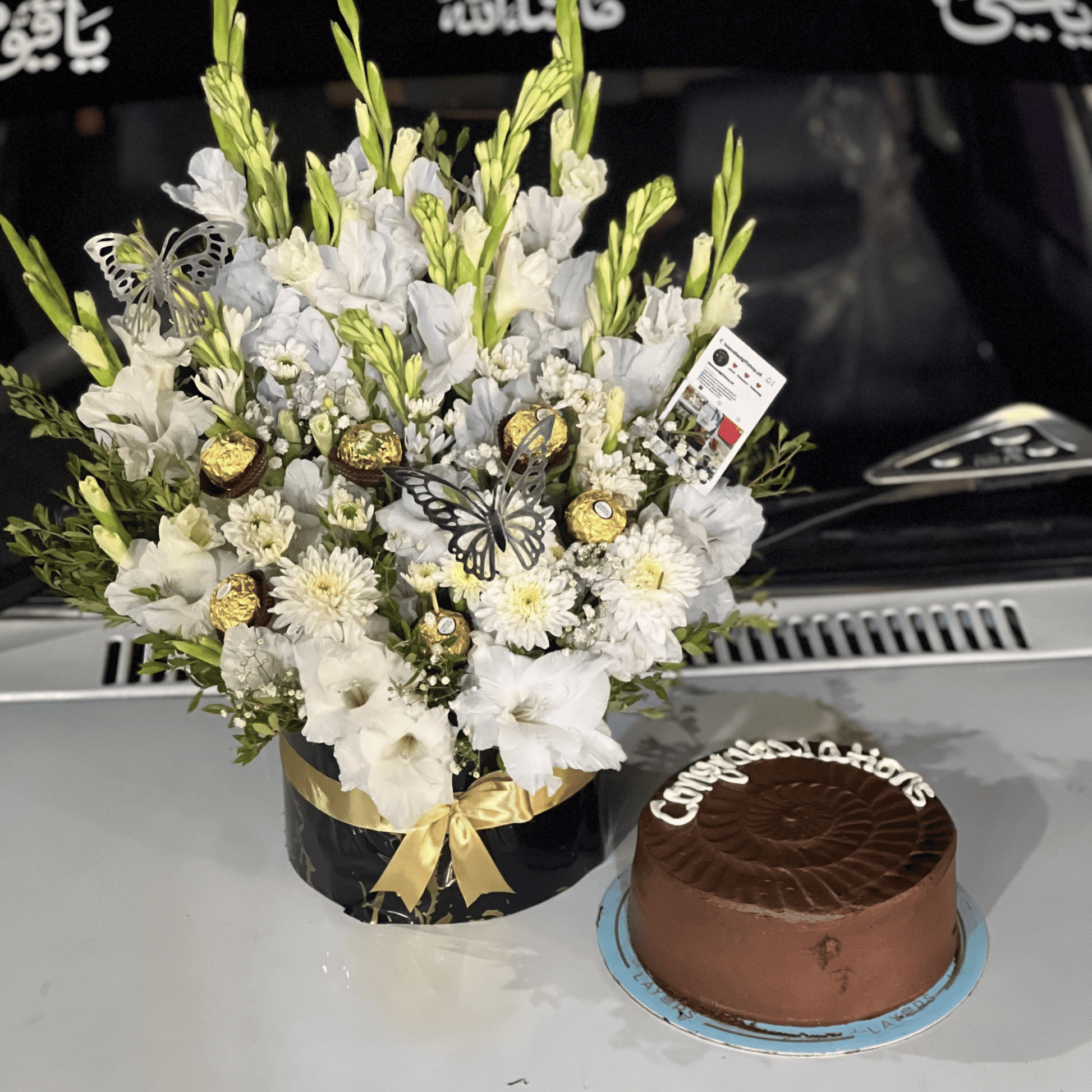 Imported Flower & Ferrero Rocher Bouquet with Custom Cake