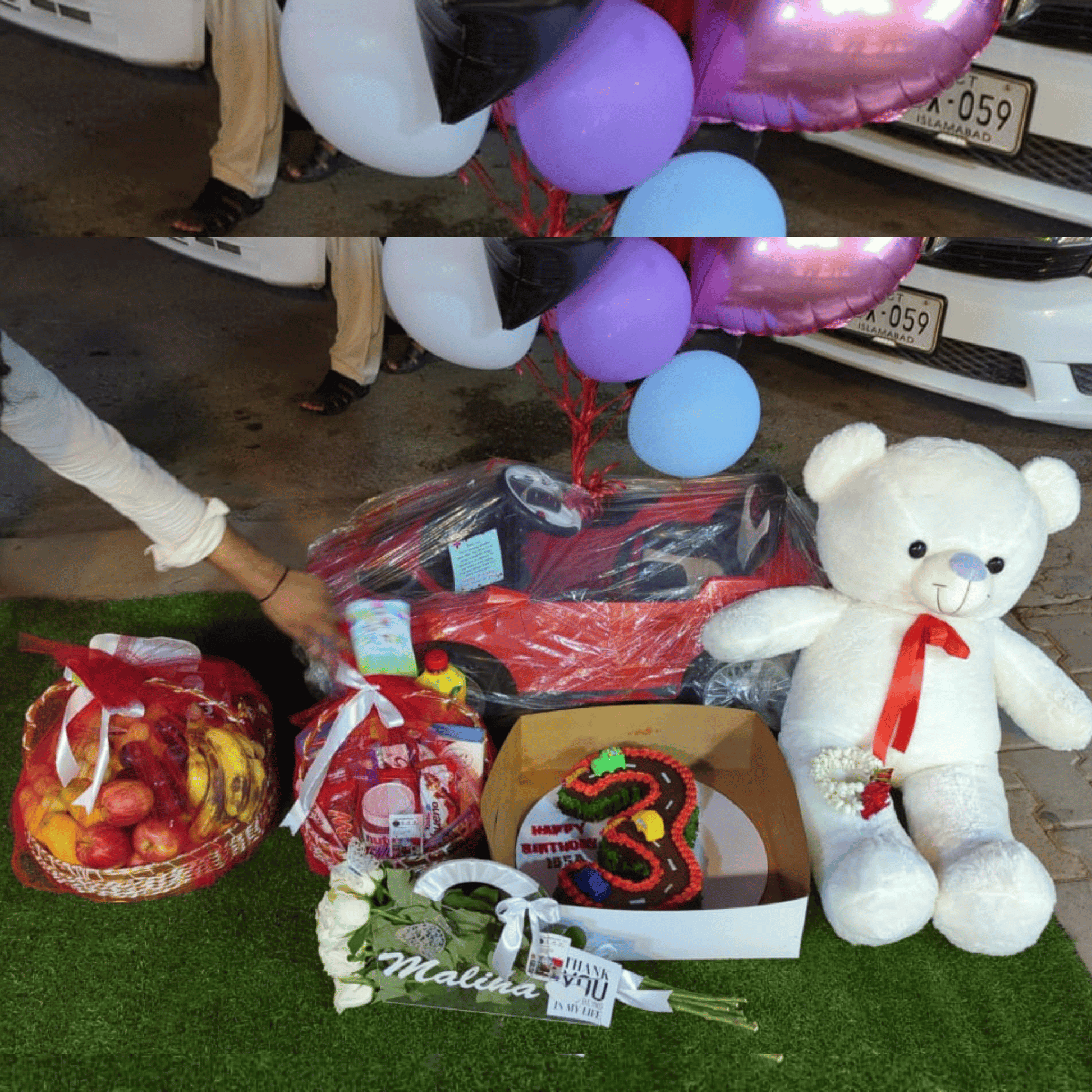 Customized cake 3 number or whatever age number you mentionedChocolates snacks juices basket 🧺