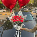 Is this bouquet suitable for an anniversary? Yes, this elegant and meaningful bouquet is an excellent choice for an anniversary, combining the classic romance of red roses with a unique and modern presentation.