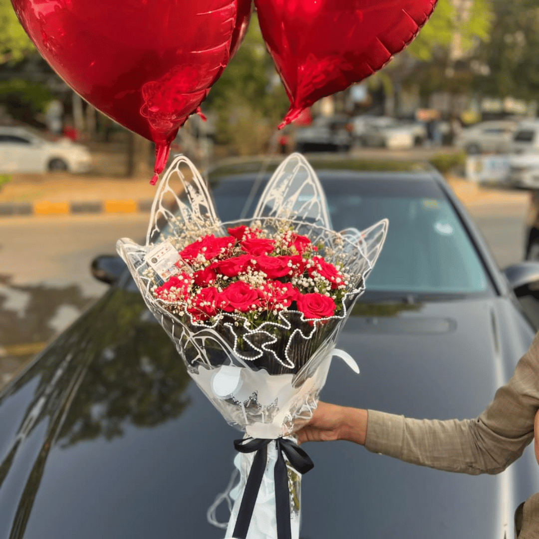 A breathtaking blend of imported blooms: This stunning bouquet features fresh imported red roses, symbolizing deep love, and delicate baby's breath, representing everlasting affection.