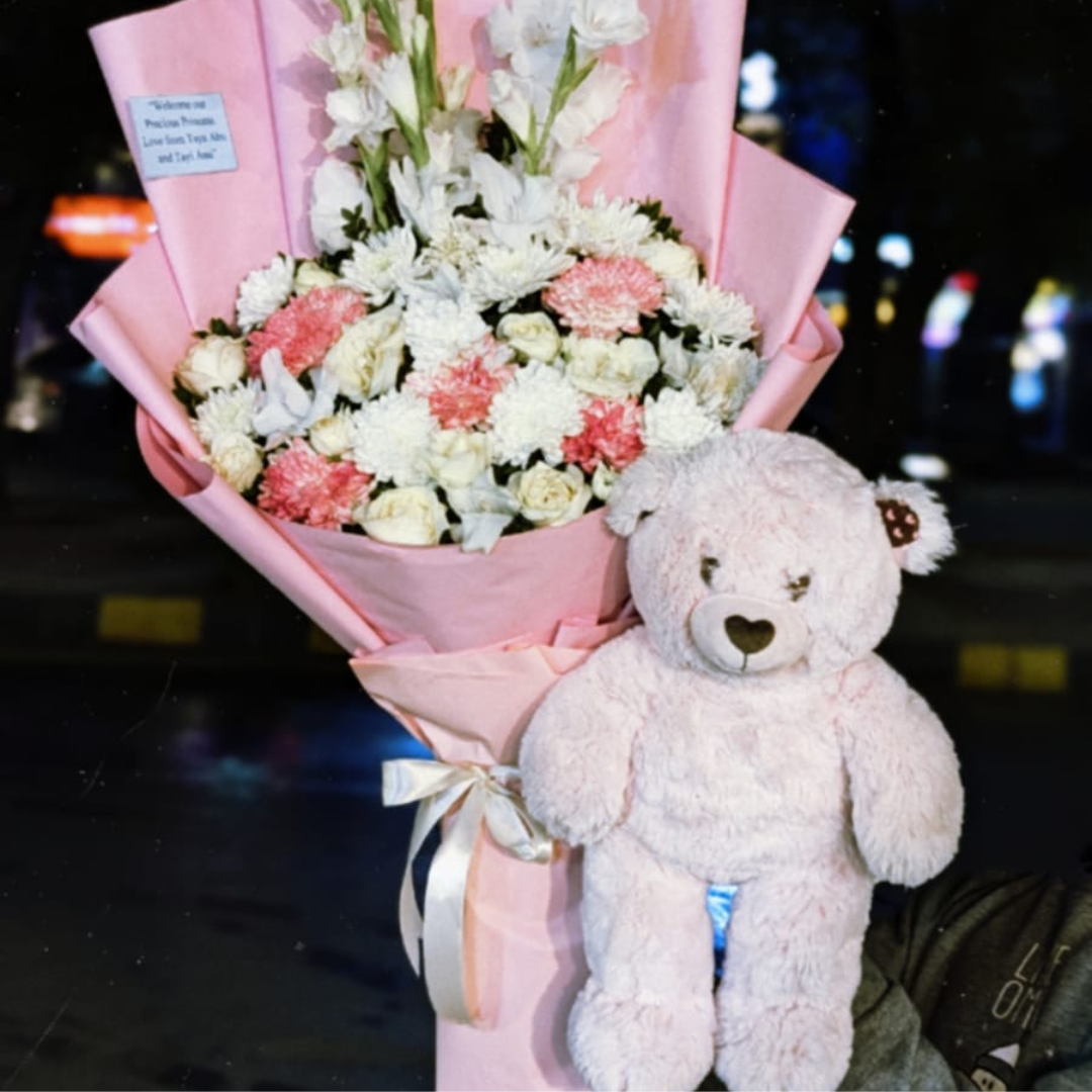 - 🧸 Adorable Mini Teddy – A soft and cuddly teddy bear to complement the flowers.