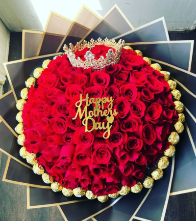 Our Red Roses Bouquet with Ferrero Rocher and a Happy Mother’s Day Topper combines the timeless beauty of roses with the irresistible sweetness of chocolates, all topped with a festive greeting — a perfect gift to melt Mom’s heart.
